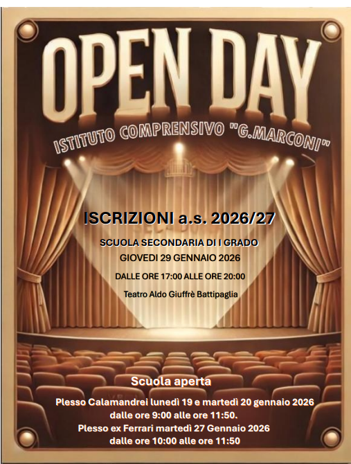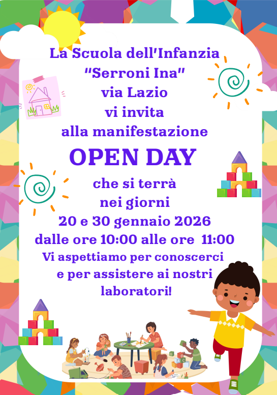 Stampa / Condividi Stampa Invia Condividi Facebook Twitter Linkedin 03/01/2026 Iscrizioni alle scuole dell’infanzia e alle scuole di ogni ordine e grado per l’anno scolastico 2026-2027 Nota MIM Iscrizioni alle scuole dell’Infanzia e alle scuole del primo e del secondo ciclo di istruzione a.s. 2026-27 Informativa sul trattamento dei dati personali Allegato A Scheda iscrizione scuola infanzia Allegato B Scheda scelta Religione Cattolica Allegato C Scheda attività alternativa alla Religione Cattolica Informativa per il trattamento dei dati personali alunni e famiglie Informativa utilizzo Google Workspace Consenso ex art. 9 Regolamento UE/679/2016 per il trattamento dei dati personali degli alunni e delle loro famiglie Liberatoria Workspace Servizi base minori di 14 anni Netiquette Servizi digitali 08/01/2026 OPEN DAY E SCUOLA APERTA