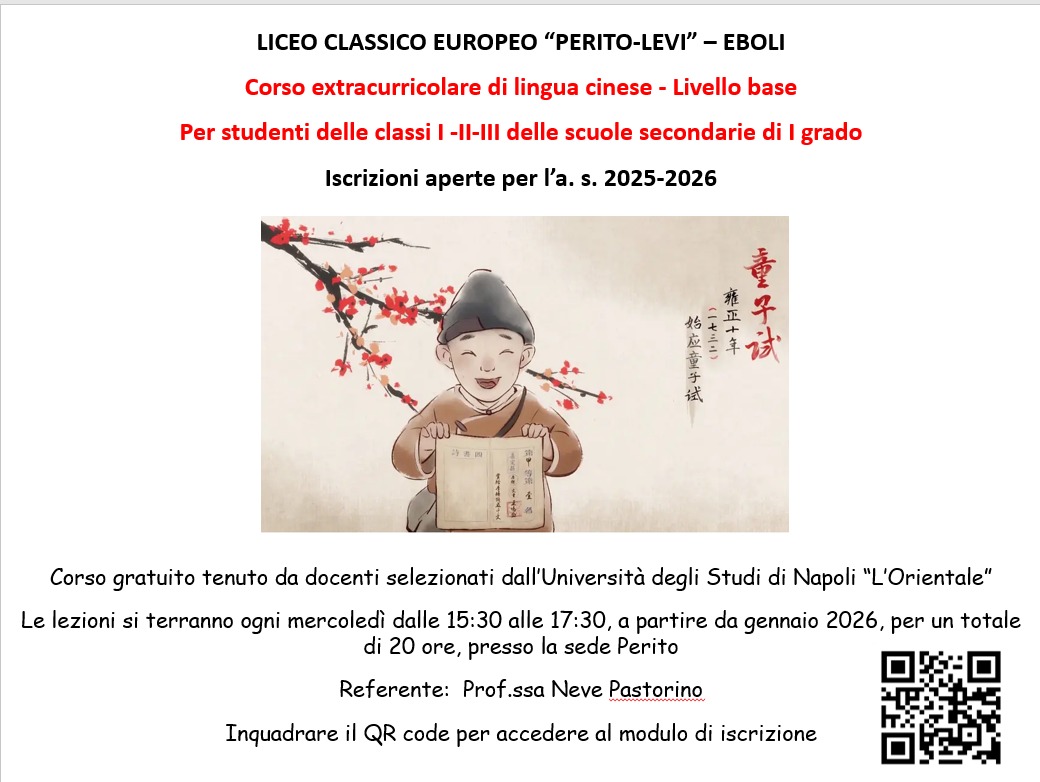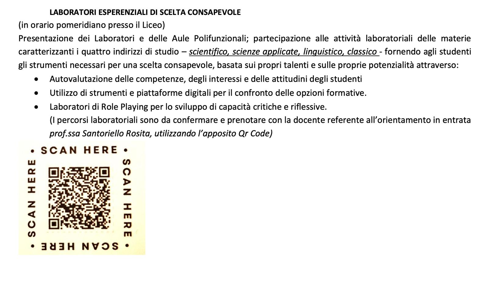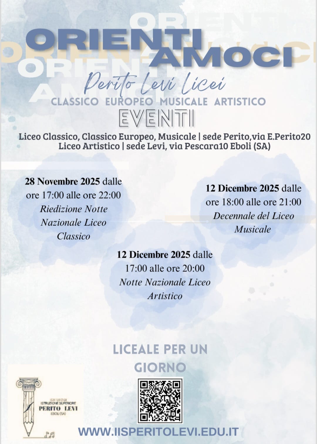 | Attività di orientamento Liceo Perito Levi di Eboli Qr code per giornata da liceale Notte dei licei classici Corso di cinese in partenza da gennaio 2026 |