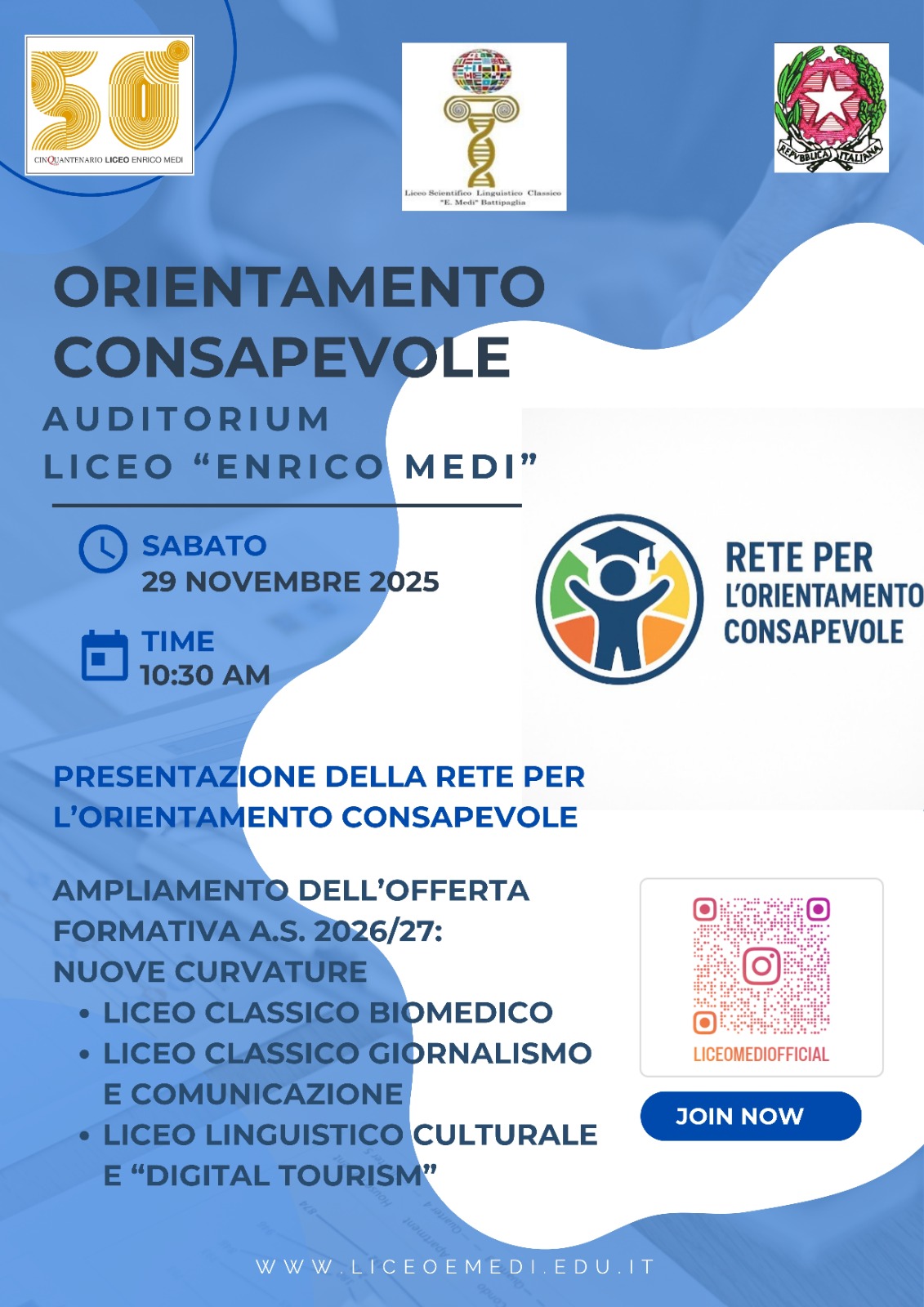 | Attività di orientamento “Liceo Medi” di Battipaglia Organizzazione delle attività di orientamento – Presentazione dell’accordo di rete con le scuole di primo grado del territorio Date open day – giornate da liceale da concordare con le scuole QR code per prenotare laboratori pomeridiani presso il Liceo Presentazione della rete per l’Orientamento Consapevole Presentazione nuove curvature |