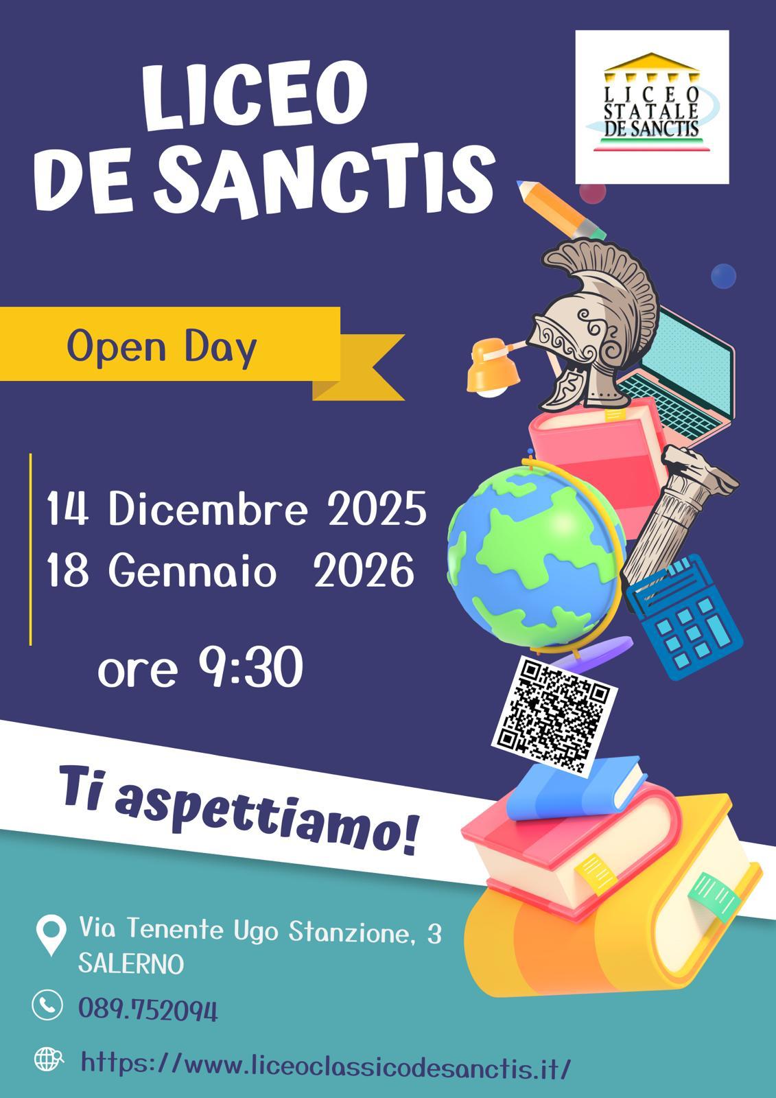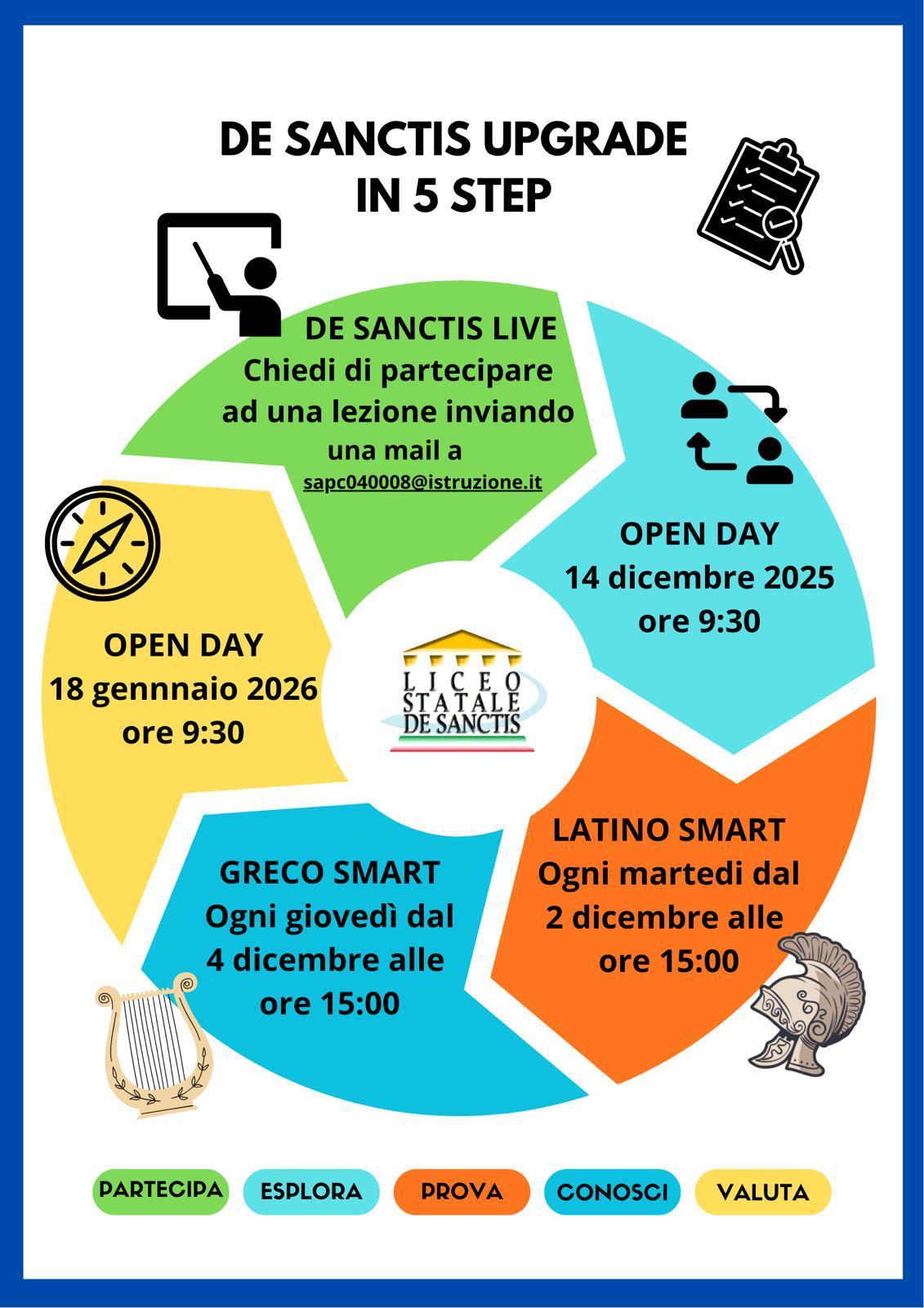 | Attività di orientamento Liceo Statale “F. De Sanctis” di Salerno Appuntamenti Open Day De Sanctis in 5 step Attività orientamento anno scolastico 2025/2026 |