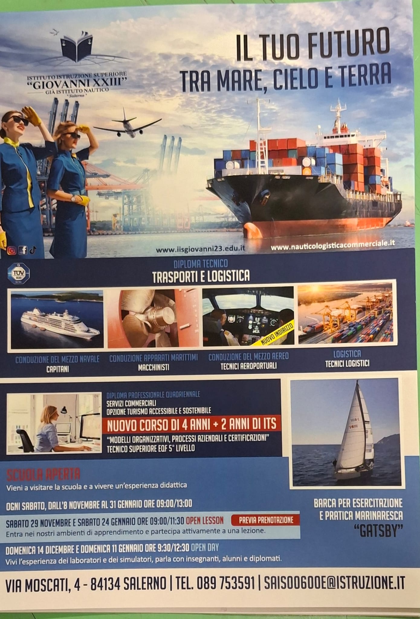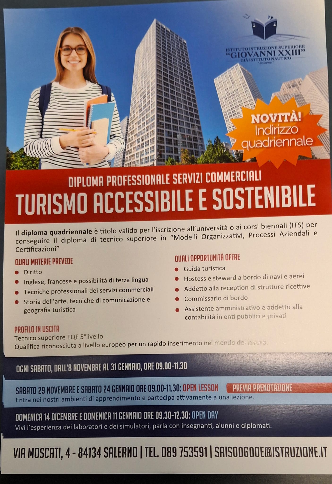 | Materiale informativo Istituto Giovanni XXIII di Salerno Presentazione dell’istituto Nuovo indirizzo quadriennale – Diploma Servizi Commerciali Turismo accessibile” Appuntamenti Open Day |