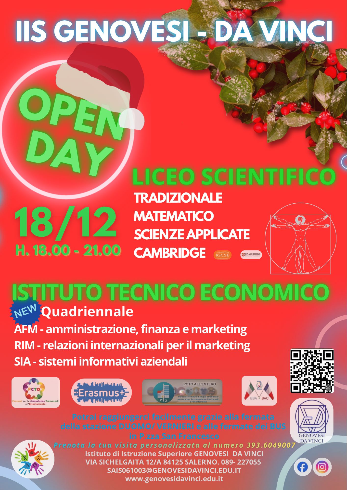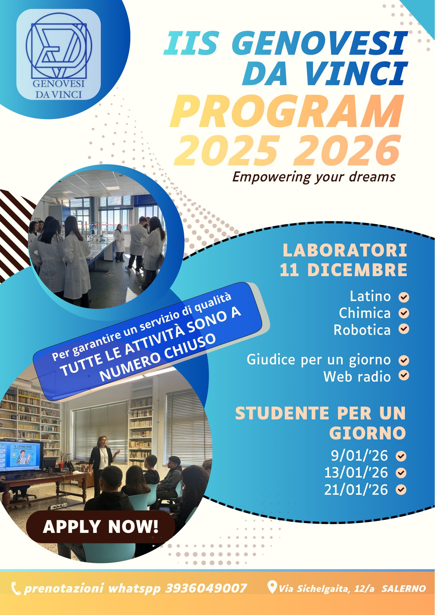 | Attività di orientamento dell’ Istituto Istruzione Superiore “Genovesi – Da Vinci” di Salerno Presentazione percorsi di orientamento “Scopri, Vivi, Impara: esperienze oltre la lezione” Appuntamenti Open day Lab Party – nuovi laboratori giovedì 11 dicembre Open Day e giornata da studente Genovesi- Da Vinci: date e modalità di prenotazione |